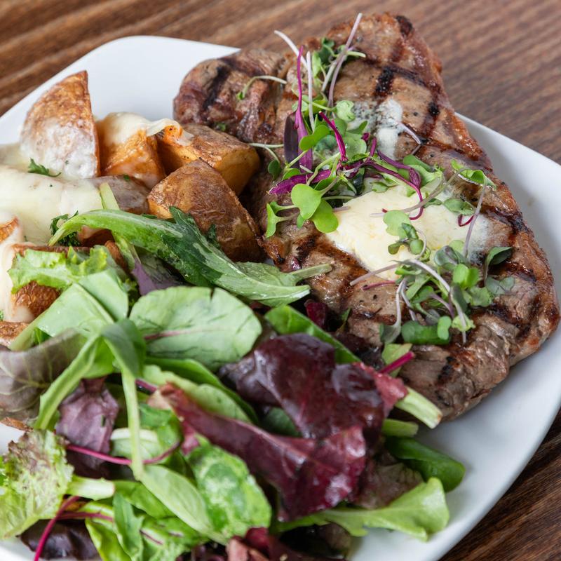 Add: Bleu Cheese Crumble +$1.25 | Button Mushrooms +$2.00 | Fried Onions +$1.00 to any steak • Add Protein: Grilled or Blackened Chicken +$5.00 | Grilled or Blackened Shrimp (5) Skewer +$6.00 | Pan-Seared Salmon +$9.00 | Grilled Sirloin +$7.00 • Choice of potato: Roasted Yukon gold potatoes, Frites, or Garlic Mashed Potatoes.